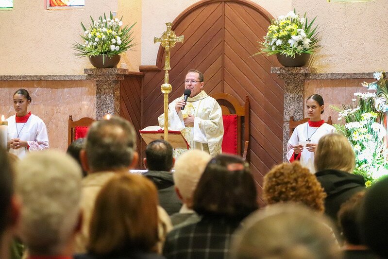 O Pe. Rafael Solano presidiu a Santa Missa do quarto dia da novena a São José Operário na noite dessa sexta feira, 25/04. A perseverança dos fiéis devotos nessa caminhada espiritual é emocionante, sempre com a igreja repleta de homens e mulheres que, aos pés o padroeiro dos trabalhadores, apresentam suas intenções e preces. Com o tema: “A esperança que gera a paz” o Padre Rafael Solano concluiu em sua homilia que São José foi o homem de confiança de Deus, em que foi dado a missão de ser educador de Jesus na terra. O ofertório foi entronizado e entregue ao Padre pelos Ministros Extraordinários da Sagrada Comunhão.