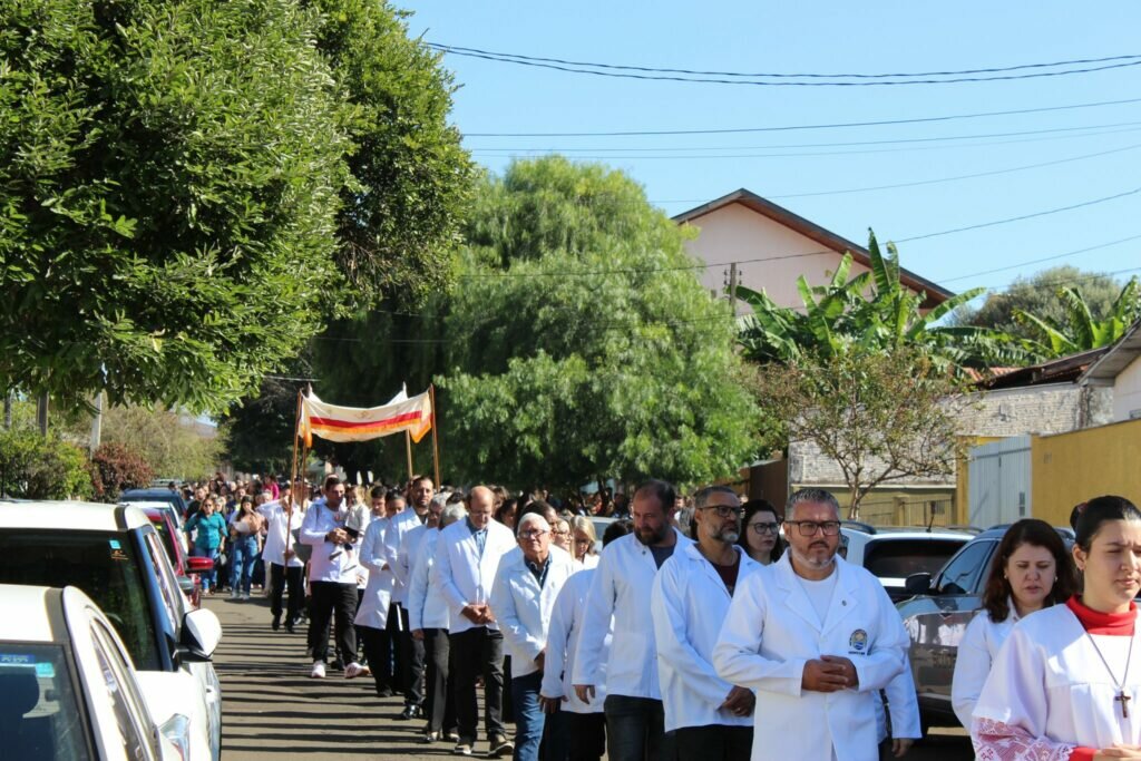 “Cristo nos leva consigo. Cristo se doa, por amor, para nos unir a Ele. A Eucaristia é um Mistério de fé que somente pode ser compreendido de joelhos! Não podemos apreendê-lo, capturá-lo com nossa razão e nossos sentidos: o paladar falha, pois saboreia pão e vinho; o tato falha, pois pega pão e vinho; a visão falha, pois enxerga pão e vinho; o olfato falha, pois cheira pão e vinho. Somente pelo ouvido, que crê o que escuta, podemos perceber o Mistério; somente a audição não falha: “Isto é o meu corpo; isto é o meu sangue! Eu sou o pão vivo descido do céu. O pão que eu darei é a minha carne dada para a vida do mundo”, disse o padre em sua homilia.