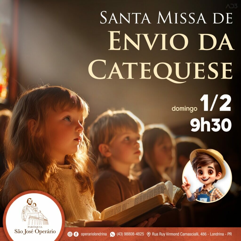 Todos os (as) catequizandos (as) e seus familiares da Paróquia São José Operário são convidados para a Santa Missa de envio e reinício da catequese de nossa comunidade. Nessa celebração queremos pedir ao Espírito Santo que fortaleça os corações de nossos catequizandos (as) no conhecimento e no seguimento da pessoa de Jesus, nosso Salvador.