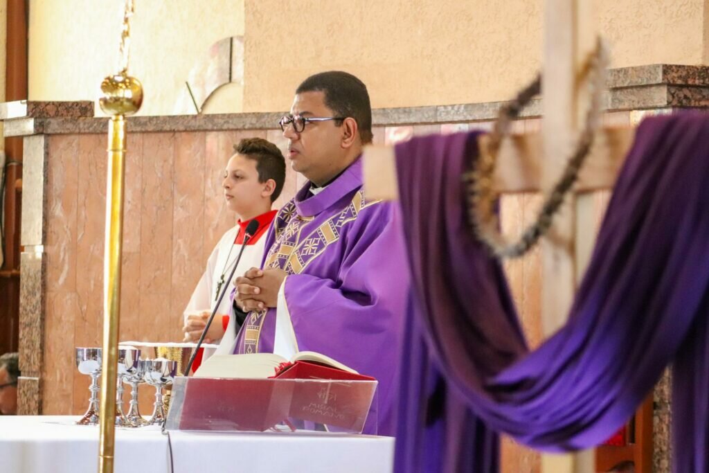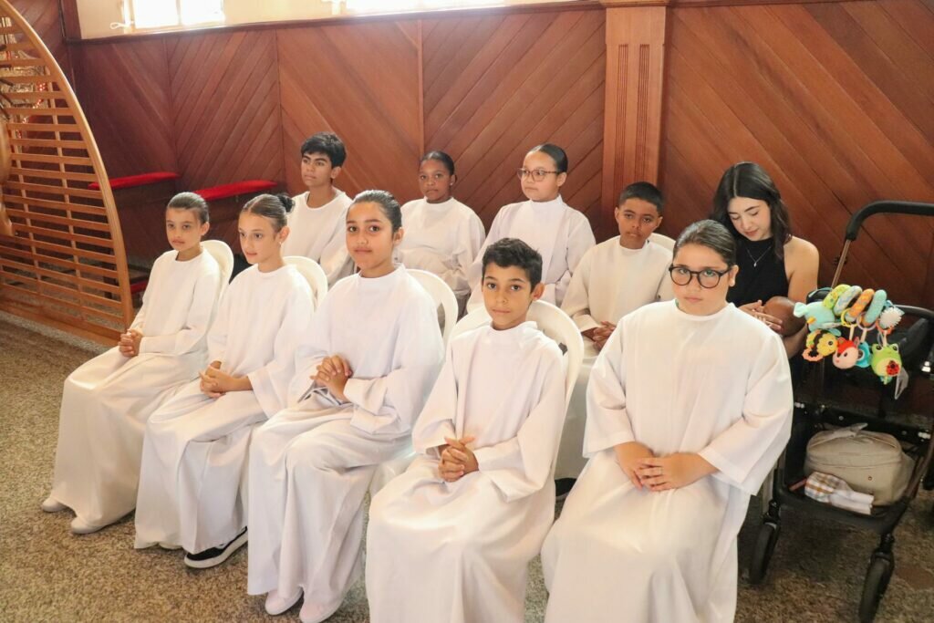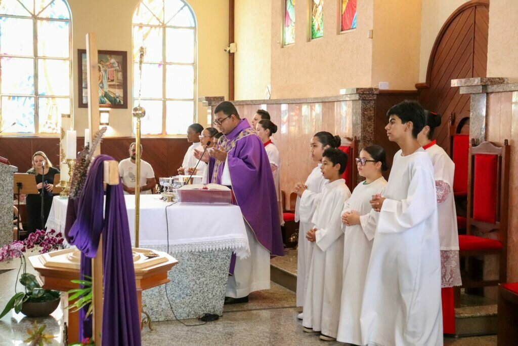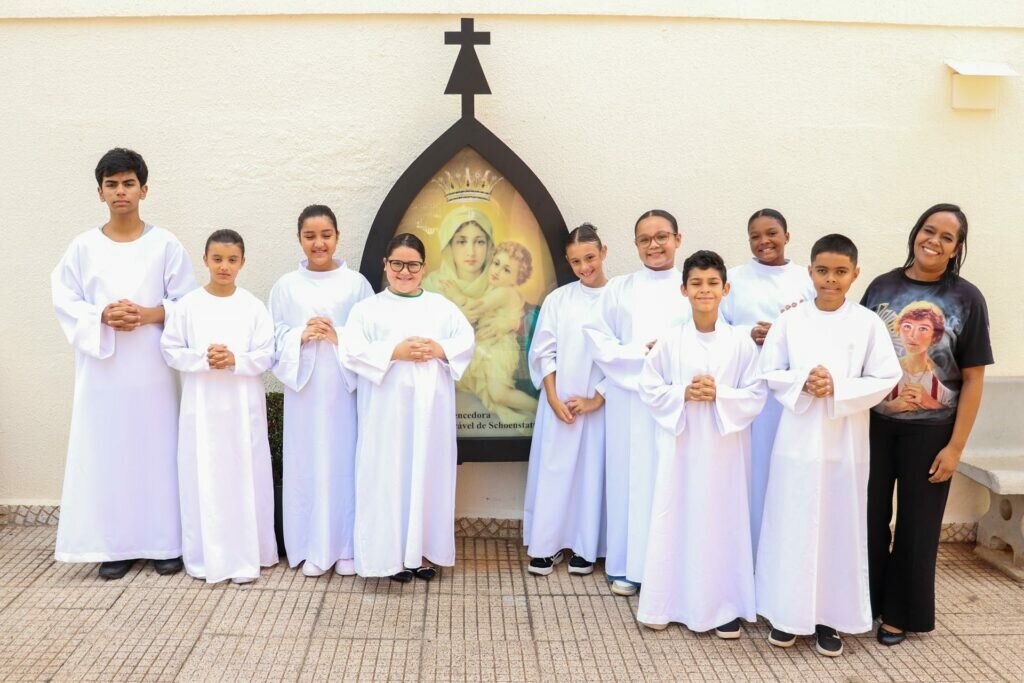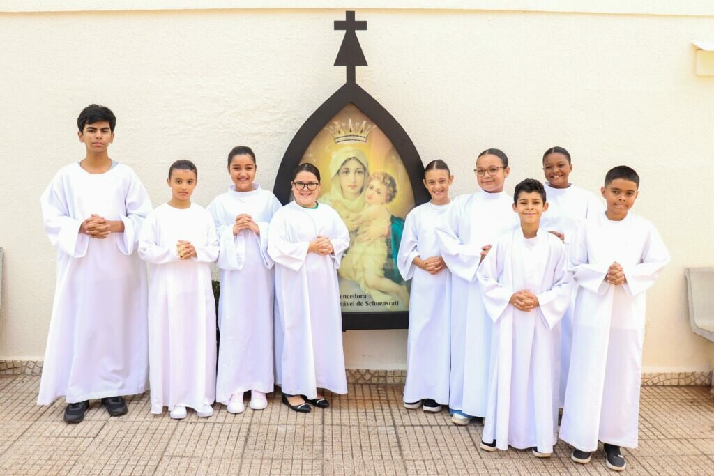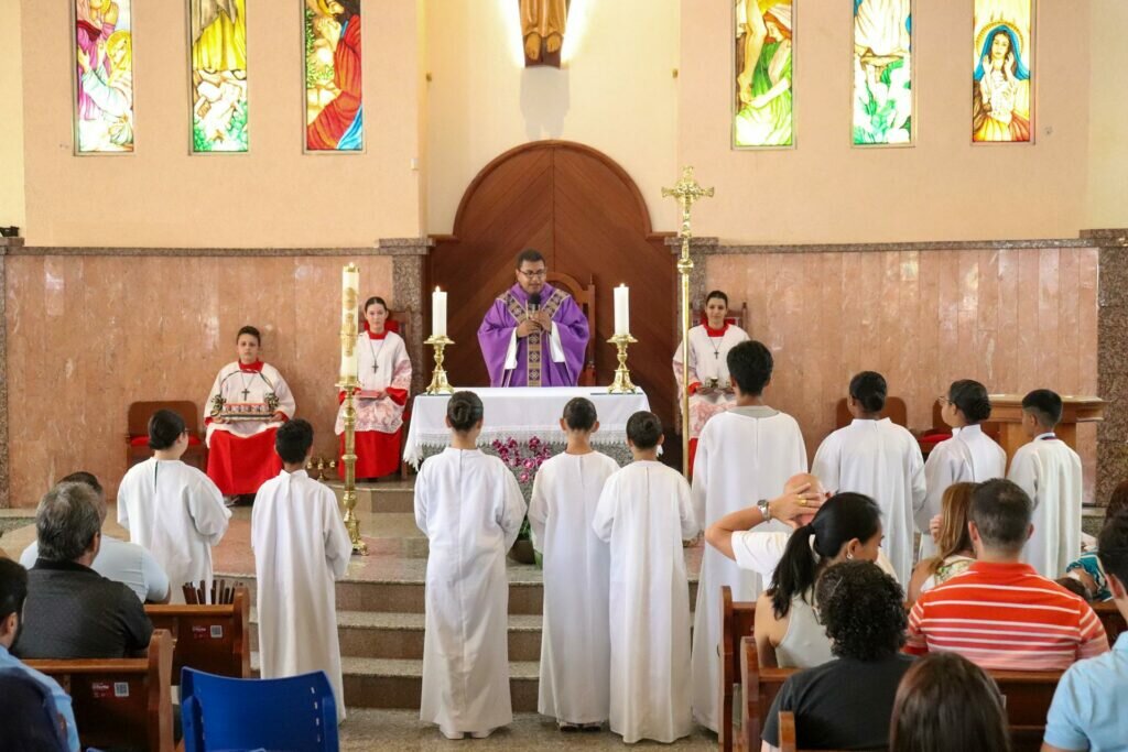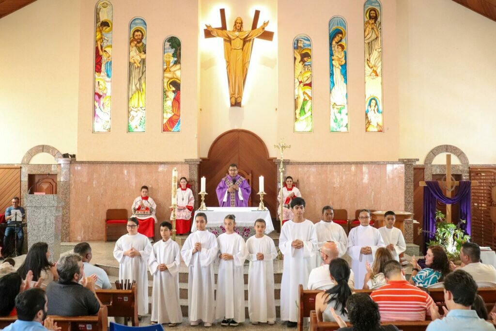 Na Santa Missa das 9h30 nesse último domingo, 22 de fevereiro, o Padre Dirceu Reis, pároco, apresentou para a comunidade paroquial os novos 9 coroinhas. Eles, vestindo túnicas brancas, iniciam um novo ciclo das formações litúrgicas: servir ao altar, nas Missas, com os coroinhas já instituídos. Essa fase é importante para que eles aprendam os ritos e as funções durante a Santa Missa e possam ser incentivados pelos coroinhas veteranos. Daqui alguns meses eles serão instituídos.