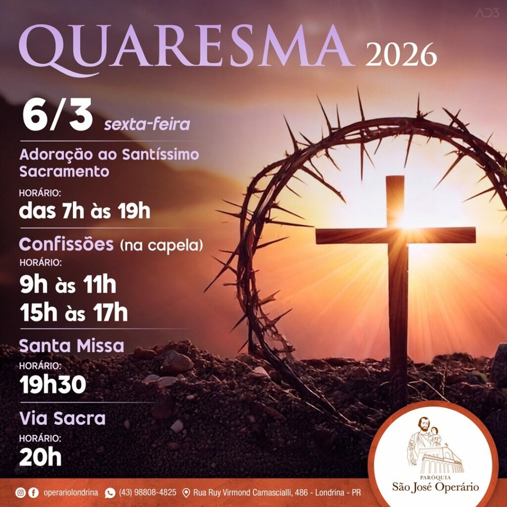 Nessa sexta feira, 27/02, das 7h as 19h o Santíssimo Sacramento estará exposto na igreja para que os fiéis realizem seu momento pessoal de oração e adoração. Na capela teremos um padre atendendo confissões, por ordem de chegada das 9h as 11h e das 15h as 17h no centro catequético. É fundamental a preparação para as confissões, as penitências recebidas devem ser realizadas dentro da igreja pois a capela é reservada apenas para atender as confissões. As 15h na capela temos a Santa Missa em honra ao Sagrado Coração de Jesus. As 19h30 teremos a Santa Missa e as 20h o rito penitencial da Via Sacra.